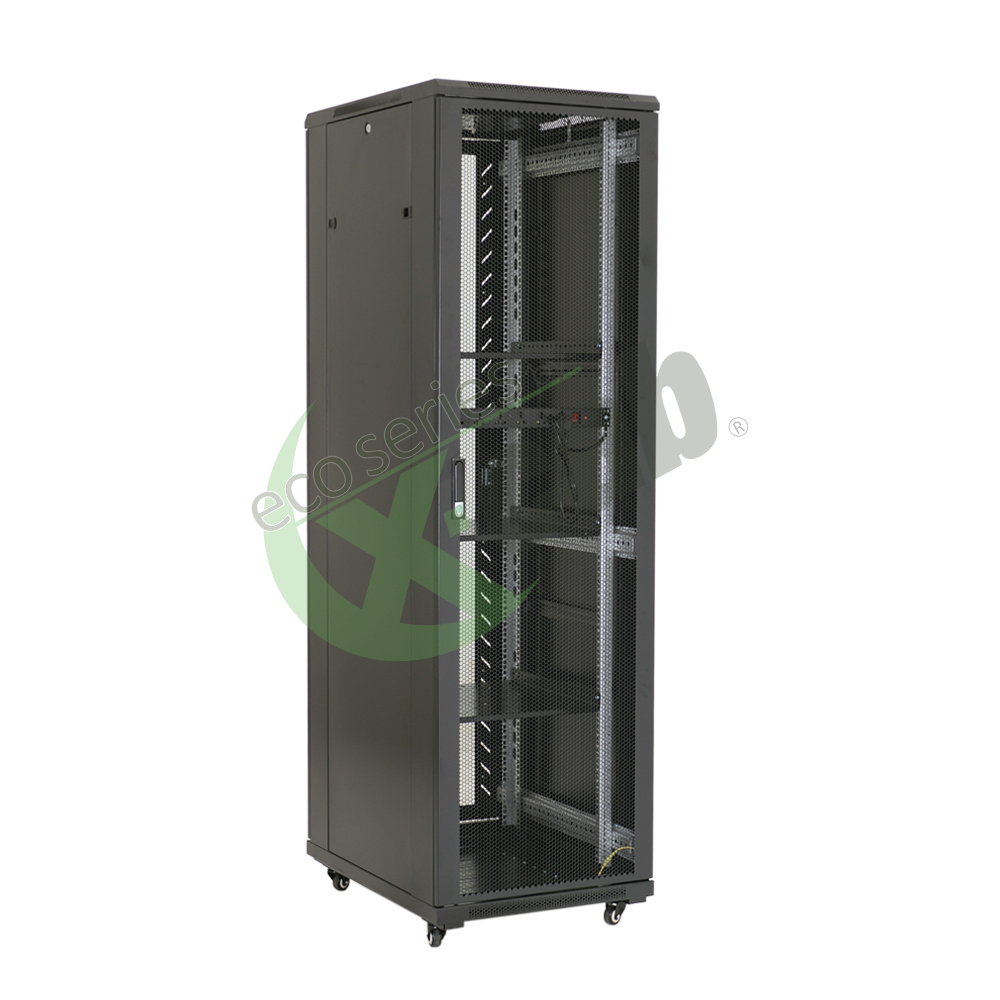 32U Stand alone cabinet 19", dimensiuni de gabarit: 600x600mm(H:1610mm), usa fata si usa spate metal perforat inchidere cu cheie, include roti si picioare, unitate de ventilatie cu 2 ventilatoare 12cm/230V, aprox. 40 de suruburi cu piulita incastrabila, negru RAL9004, laterale detasabile, 4 montanti cu unitatile numerotate, impamantare pentru rack, usile se pot monta cu deschidere pe stanga sau pe dreapta, structura solida, suporta incarcare statica 800Kg, livrare dezasamblata (4 colete), IP-20, greutate fizica:80kg, greutate volumetrica 88kg, standarde: CE, ROHS, AMSI/EIA RS-310-D,IEC297-2, DIN4149, PART1, DIN41494, Part7, ETSI Standard. Material: SPCC cold rolled steel. Grosime: montanti 2,0 mm, suport montanti 1,2 mm, restul componentelor 1,0 mm. Acoperire: montantii si suportii montantilor placati cu Zinc pentru a asigura impamantarea, restul componentelor acoperite cu pulberi in camp electrostatic.Specificatii
