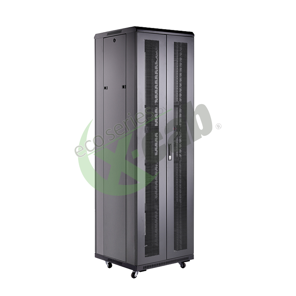 42U Stand alone cabinet 19", dimensiuni de gabarit: 600x800mm (H:2055mm), usa fata metal perforat si spate metal perforat dubla deschidere, inchidere cu cheie, include roti si picioare, unitate de ventilatie cu 4 ventilatoare 12cm/230V, 4 montanti, laterale detasabile, aprox. 50 set surub cu piulita incastrabile, impamantare pentru rack, negru RAL9004, usile se pot monta cu deschidere pe stanga sau pe dreapta, structura solida, suporta incarcare statica 800 Kg, livrare dezasamblata (4 colete), IP-20, greutate fizica:110kg, 125Kg greutate volumetrica, standarde: CE, ROHS, AMSI/EIA RS-310-D,IEC297-2, DIN4149, PART1, DIN41494, Part7, ETSI Standard. Material: SPCC cold rolled steel. Grosime: montanti 2,0 mm, suport montanti 1,2 mm, restul componentelor 1,0 mm. Acoperire: montantii si suportii montantilor placati cu Zinc pentru a asigura impamantarea, restul componentelor acoperite cu pulberi in camp electrostatic.Specificatii