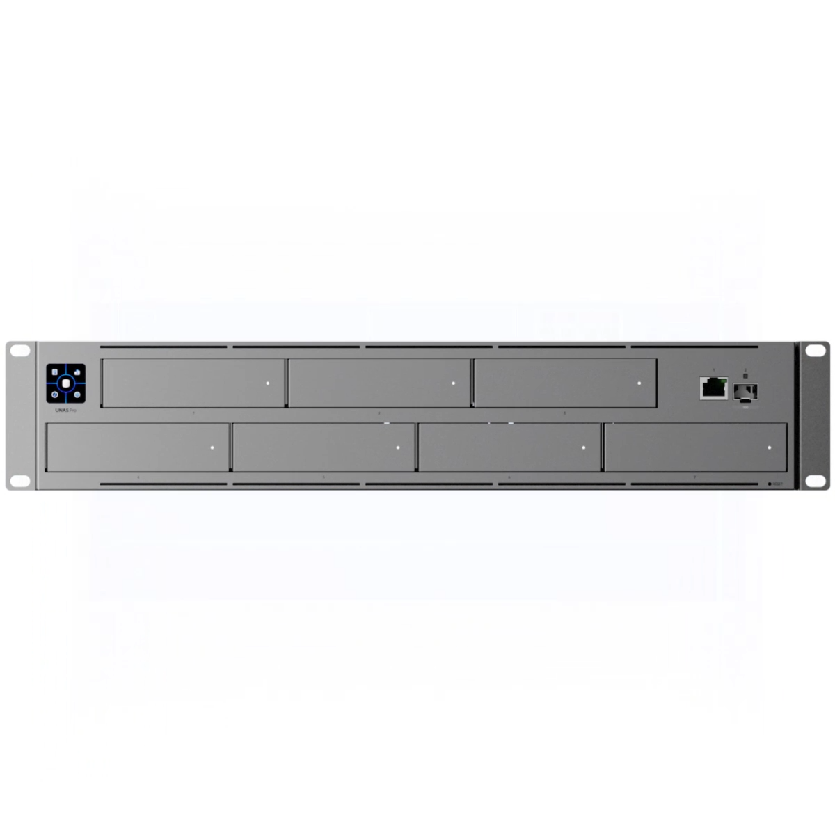 "2U rack-mount NAS with (7) 2.5/3.5"" drive bays and 10 Gbps performance designed for large-scale file storage and sharing. (7) 2.5/3.5"" HDD / SSD support (1) 10G SFP+ uplink and (1) GbE RJ45 port Data protection with RAID storage technology UniFi Power Backup ready 1.3"" touchscreen for management"